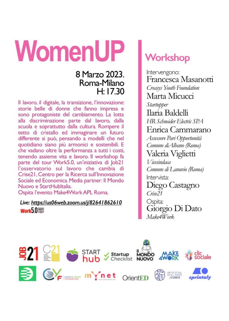 L'8 marzo è ormai una data indissolubilmente legata alla tematica dell'uguaglianza di genere e, vista la situazione corrente, lo sarà ancora per un po'. In questa data Diego Castagno sarà ospite di Make4Work ed assieme a Giorgio Di Dato avranno modo di raccontare qualche storia (bella) di donne che" fanno cose e vedono gente", senza retorica e senza inutili moralismi. Con loro saranno presenti anche Francesca Masanotti di Creasys Youth Foundation, Ilaria Baldelli, Enrica Cammarano, assessore pari opportunità del comune di Albano, e Valeria Viglietti, vicesindaco del comune di Lanuvio.